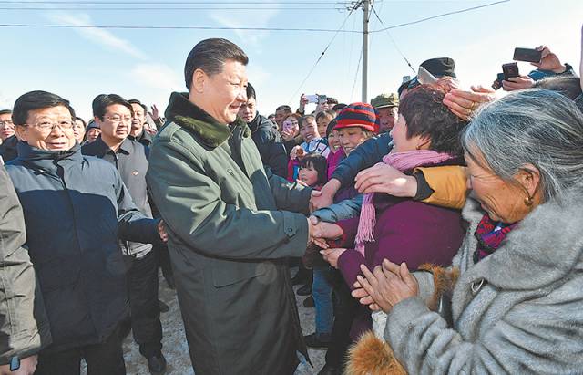 2017年1月24日,中共中央總書(shū)記、國(guó)家主席、中央軍委主席習(xí)近平來(lái)到河北省張家口市,看望慰問(wèn)基層干部群眾,考察脫貧攻堅(jiān)工作。這是習(xí)近平在張北縣小二臺(tái)鎮(zhèn)德勝村看望慰問(wèn)村民,向鄉(xiāng)親們拜年。(資料片)新華社發(fā)